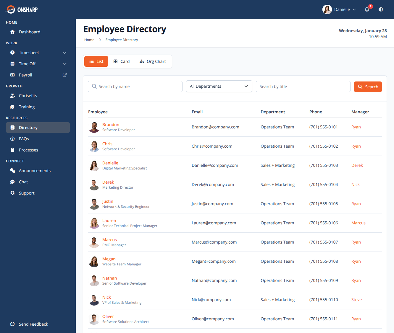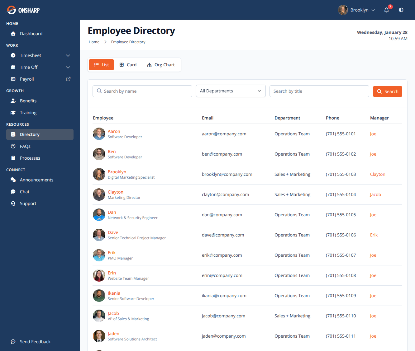 Explore your organization's structure with an interactive org chart and searchable employee directory.