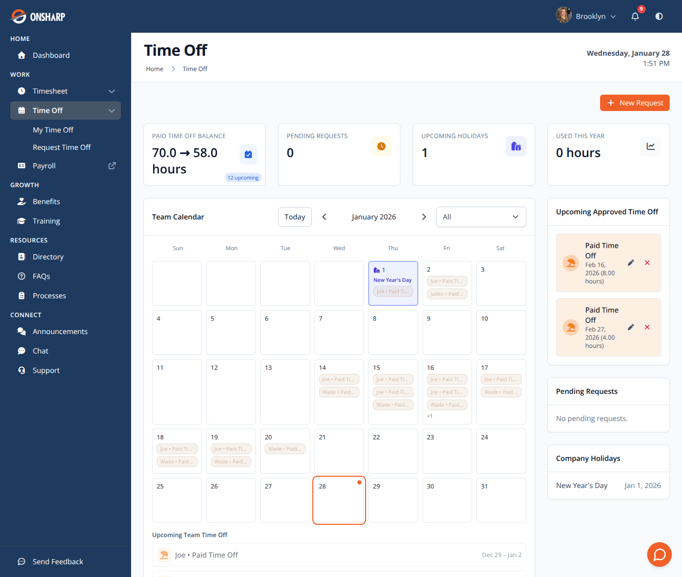PTO visibility, time off requests, and approval workflows. Employees can see their balance and request time off without emailing HR.